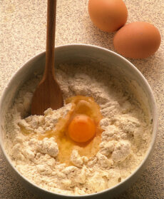 Per prima cosa, metti il burro ammorbidito in una terrina e lavoralo insieme a 75 g di zucchero finché non otterrai una crema spumosa. Aggiungi alla crema ottenuta la farina setacciata insieme al lievito, un pizzico di sale, le uova, uno per volta, e il latte.