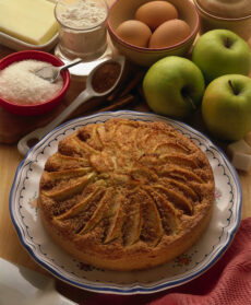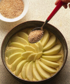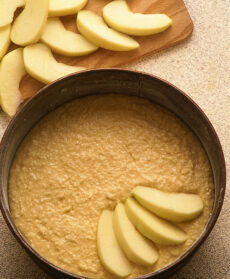 Sbuccia le mele, elimina il torsolo e i semi e affettale finemente. Procurati uno stampo a cerniera di circa 24 cm, imburralo e versa al suo interno il composto ottenuto. Distribuisci in superficie le mele a fettine, affondandole leggermente.
