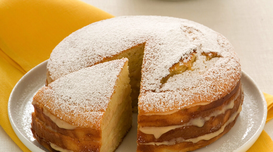 4) Taglia la torta in 4 strati e tieni da parte l'ultimo, cioè la calotta superiore. Spalma il primo strato con la crema di yogurt caramellata, sovrapponi il secondo, spalmalo con altra crema e fai lo stesso con il terzo strato. Disponi anche la calotta superiore e spolverizzala con lo zucchero a velo.