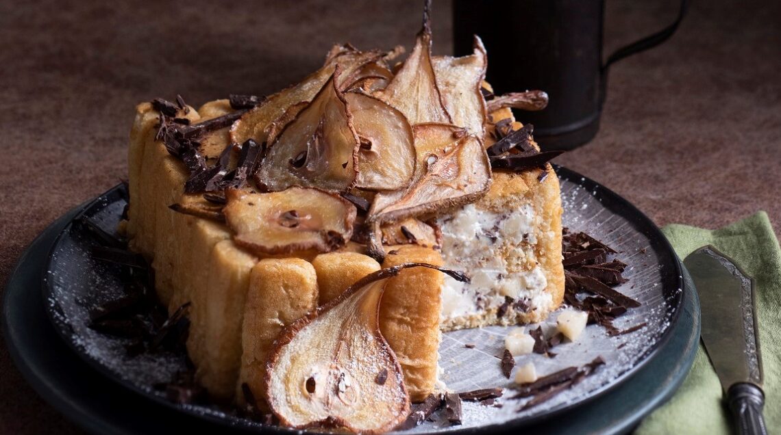 3 Tagliate le pere rimaste a fette di 2 mm, allineatele su una teglia rivestita di carta da forno e spolverizzatele con 10 g di zucchero a velo. Infornatele per 40 minuti a 160°, poi togliete dal forno. Sformate la charlotte su un piatto da portata, decoratela con le pere candite e il cioccolato rimasto tritato; spolverizzatela con lo zucchero a velo rimasto e servite.