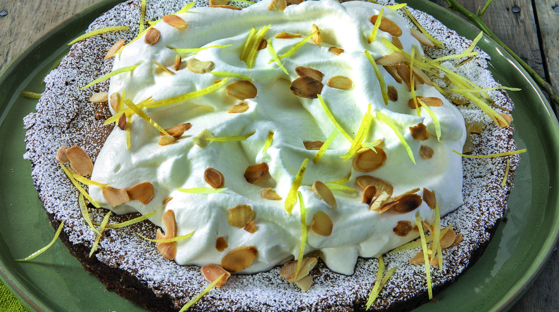 4 Montate il composto di panna e limoncello con la frusta elettrica, incorporate la scorza di limone e distribuite la crema la preparata sulla torta lasciando liberi circa 2 cm lungo il bordo. Distribuite sulla superficie le mandorle tostate, le scorze candite di limone e servite.