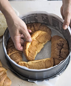 I deliziosi frutti autunnali farciscono una torta scenografica: la croccantezza delle mandorle e l'irresistibile morbidezza dei croissant. Sapori d'infanzia mescolati in un suggestivo mix di dolci sensazioni.
