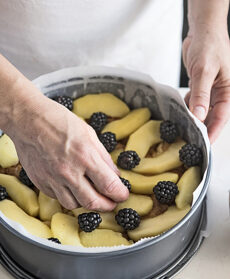 Foderate di carta da forno uno stampo a cerniera da 24 cm di diametro. Sbucciate le mele e tagliatele in 12 spicchi ciascuna. Scaldate 80 ml di acqua con 1 cucchiaio di zucchero a fuoco medio in una larga padella antiaderente. Unite gli spicchi di mela e cuoceteli per qualche minuto, girandoli delicatamente finché risulteranno teneri e l'acqua sarà stata assorbita completamente. Togliete dal fuoco e fate raffreddare. Lavate le more e asciugatele bene con carta da cucina.