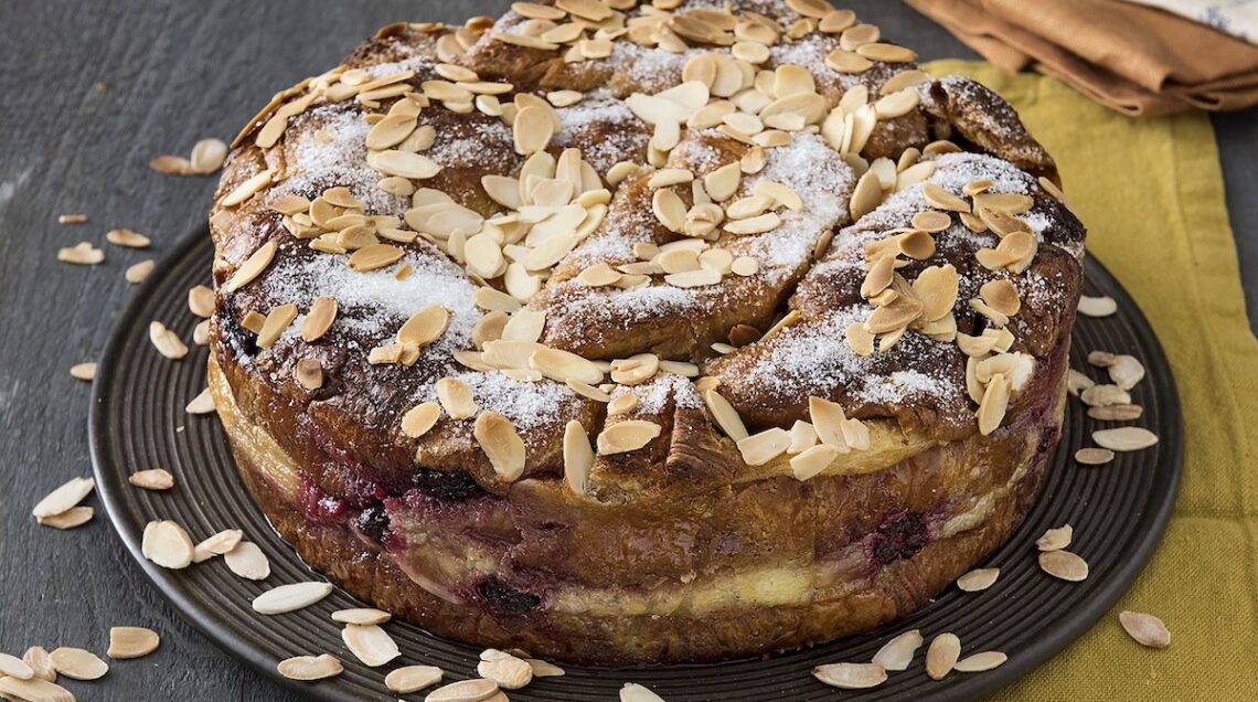 Un dolce d'effetto, preparato con croissant, farina di mandorle, frutta, cannella. Facile e creativo è anche un dessert di recupero