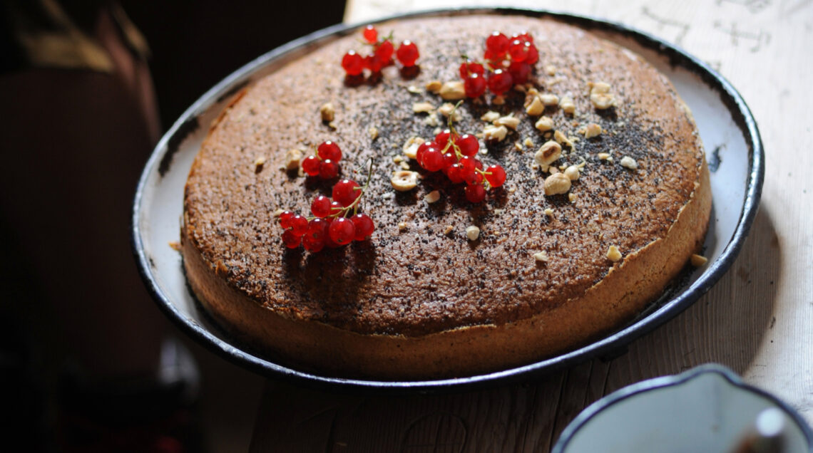 3) Guarnisci con ribes, nocciole tritate e semi di papavero. Se ti piace, prima di guarnire, spolverizza la torta con zucchero a velo.