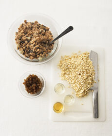 La sera prima preparate il ripieno: fate ammorbidire l'uvetta in metà Sassolino. Tostate le mandorle, tritatele grossolanamente con i canditi e gli amaretti e mescolateli con le gocce di cioccolato, il miele, 150 g di zucchero, l'uvetta con il Sassolino e gli altri liquori. Mettete in frigo.