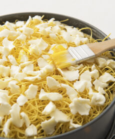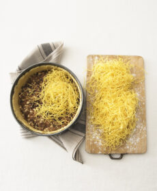 Una torta insolita preparata con un guscio di frolla arricchita con cioccolato, mandorle, cedro e amaretti e farcita con i tagliolini. La pasta fresca dopo la cottura scrocchia in bocca, regalando sensazioni appaganti non solo per il palato