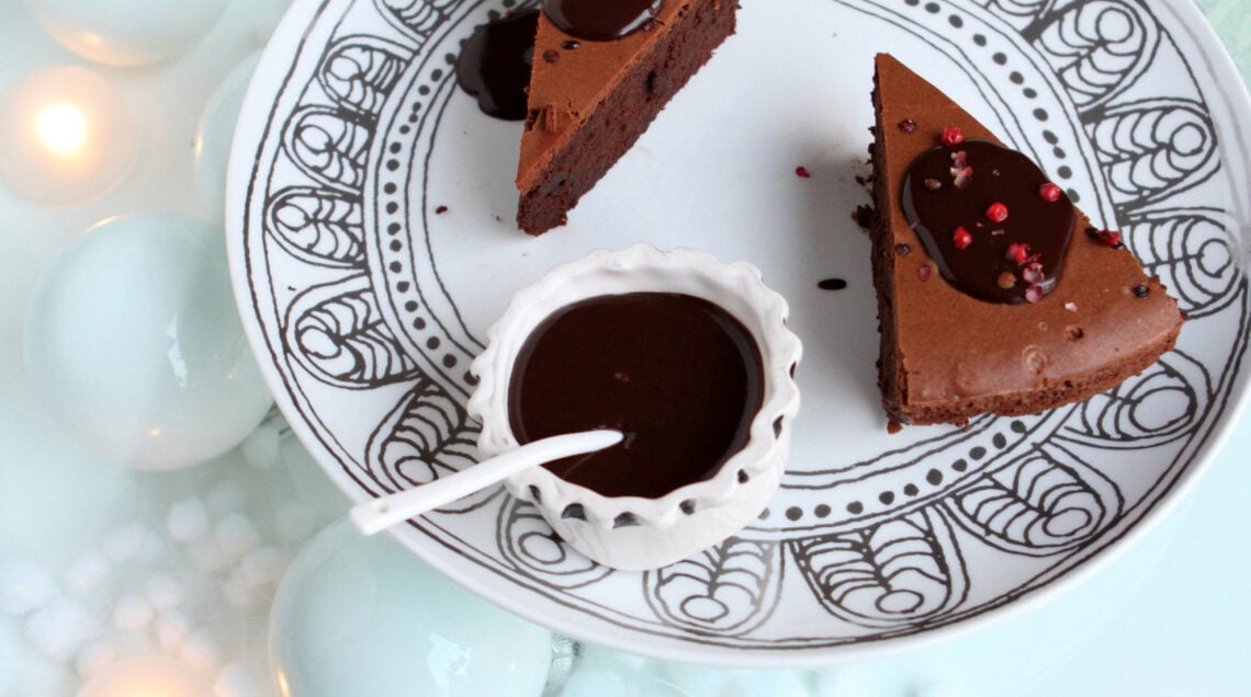4) Lascia raffreddare la torta per almeno 12 ore, prima di servirla. Come guarnizione prepara una salsa con il cioccolato fondente spezzettato rimasto (50 grammi). Porta ad ebollizione la panna, poi falla colare sul cioccolato, copri e lascia raffreddare per 5 minuti fuori dal fuoco. Mescola quindi il cioccolato dal centro del recipiente verso l'esterno con una spatola incorporando la panna fino a ottenere una salsa liscia e omogenea. Mantienila tiepida fino al momento di servirla sopra la torta.