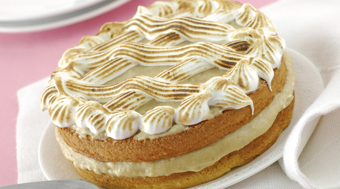 4) Per la meringa, monta gli albumi a neve con un po' di sale; aggiungi lo zucchero e sbatti per 2-3 minuti finché sarà soda. Mettila in una tasca da pasticciere, spremila sulla torta farcita alla crema e passala qualche minuto sotto il grill.