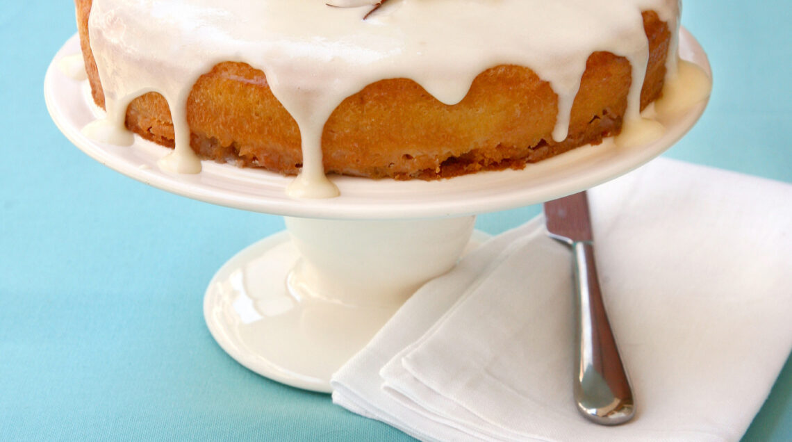 2) Sforma la torta tiepida su una griglia, bucherella la superficie e spennellala generosamente con il latte di cocco. Ripeti l'operazione altre 2 volte ogni 10 minuti e passa in frigo per una notte.