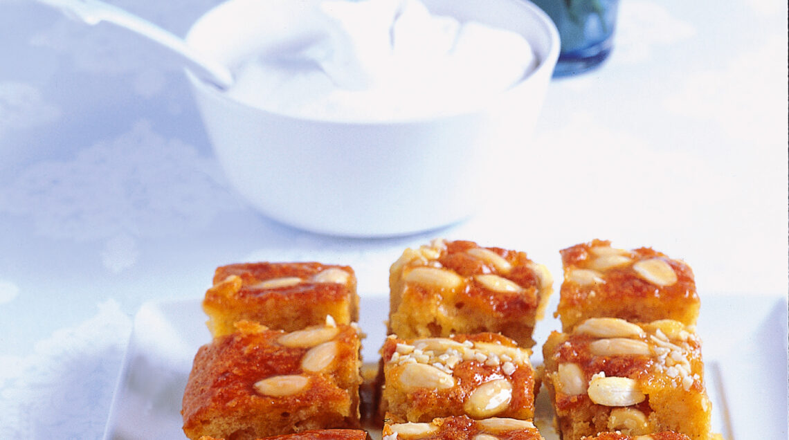 4) Versalo tiepido sulla torta e lascialo raffreddare. Servi la torta di limone e mandorle tagliata a quadrotti e accostata a ciuffi di panna semi-montata.