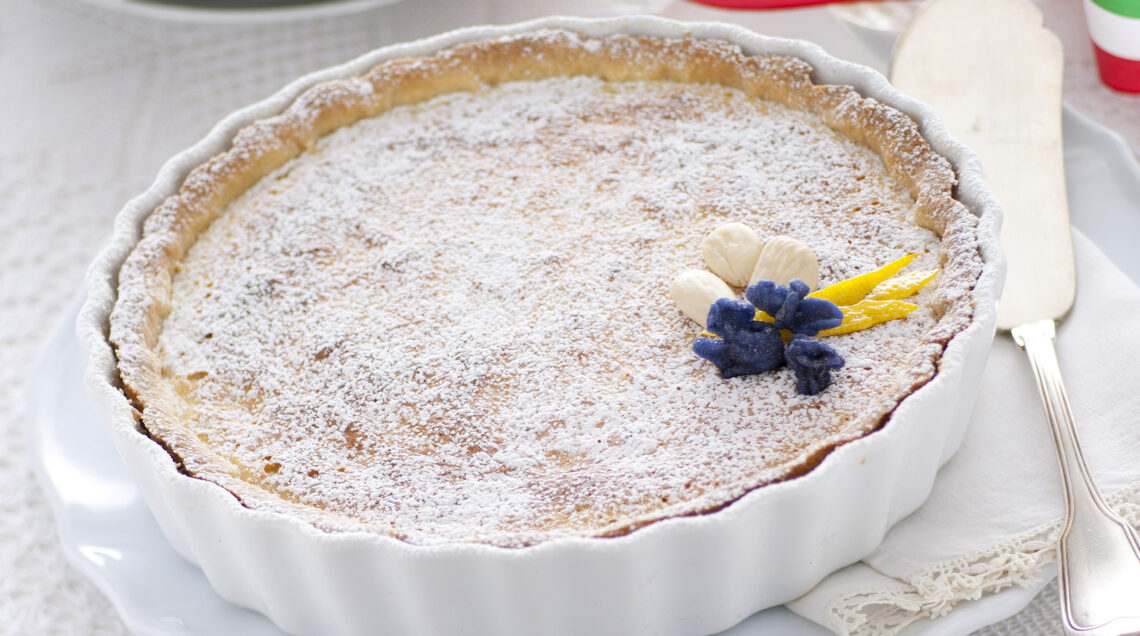 Una torta semplice nella sua veste e nei passaggi di preparazione, ma finemente squisita nel suo guscio di frolla, farcito con una crema morbida che profuma di limone e impreziosita dalle mandorle pelate. Si offre in caso di ospiti, si gusta a colazione e merenda appena cosparsa di zucchero a velo.
