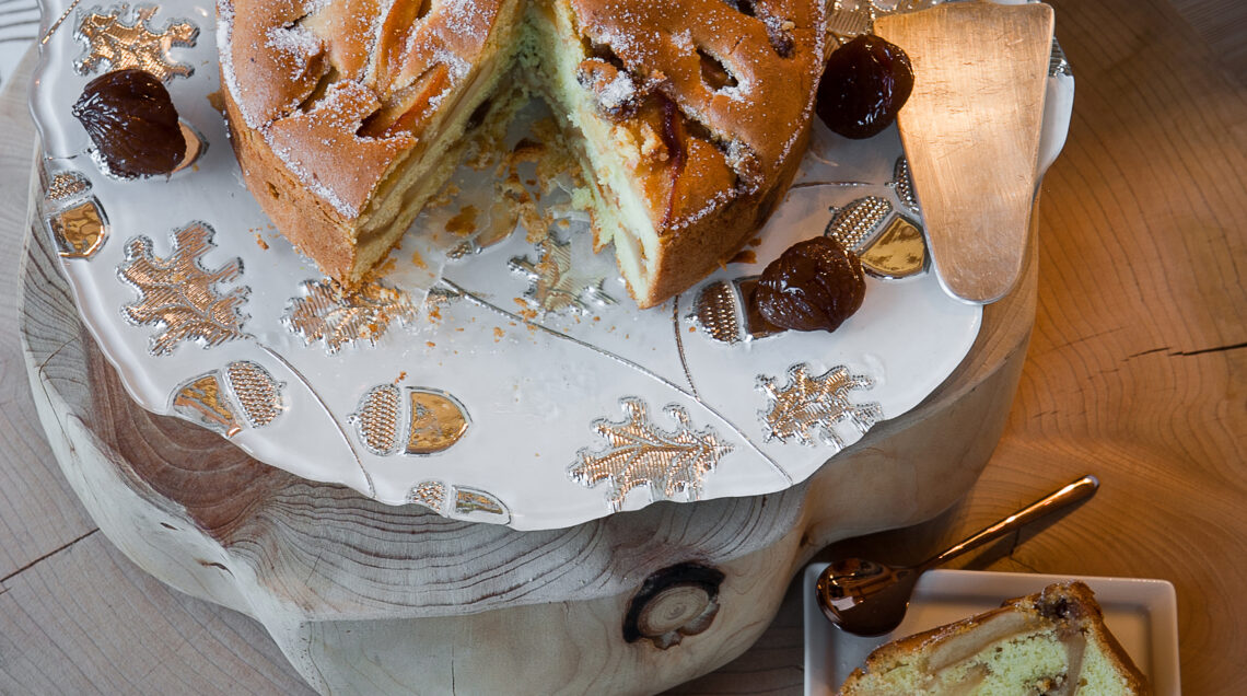 4) Infine monta la panna ben fredda con lo zucchero a velo e i semi del baccello di vaniglia. Servi la torta di mele ai marròn glacè con panna a fette con un ciuffo di panna e 1 marron glacè.