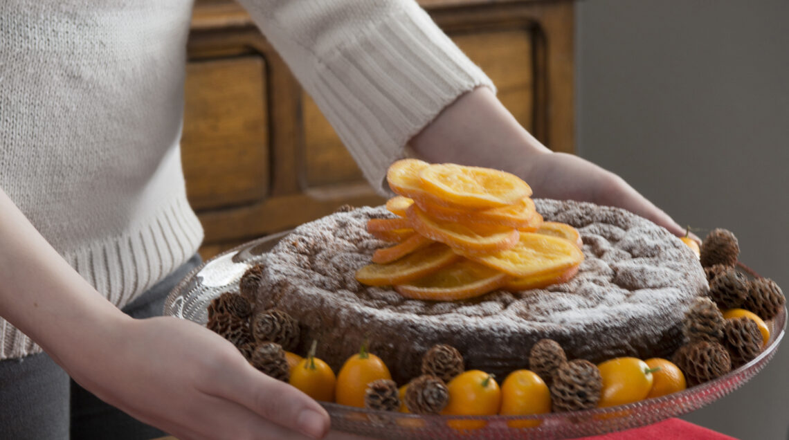9) Sforna la torta, lasciala raffreddare e trasferiscila su un piatto da portata. Cospargila con lo zucchero a velo e guarnisci con le fette d'arancia candite e i kumquat.
