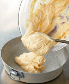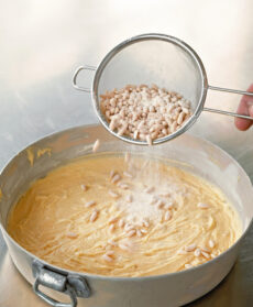 Aggiungi all'impasto metà dei pinoli e mescola ancora per amalgamare bene il tutto. Versa il composto in uno stampo del diametro di 24 cm, imburrato e infarinato, livellandolo con una spatola.
