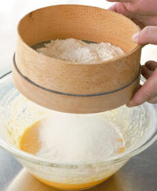 Aggiungi le uova, uno alla volta. In un’altra terrina mescola la farina con la fecola e il lievito, poi unisci gli ingredienti al composto preparato, facendoli scendere da un setaccio.