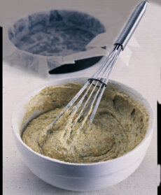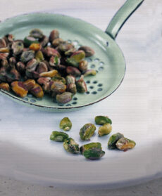 1) Porta a ebollizione in un pentolino 2 bicchieri d'acqua e versa i pistacchi; toglili dal fuoco, lasciali a bagno per 5 minuti, scolali e privali della pellicina. Asciugali, ponili nel mixer e tritali con 100 g di zucchero a velo fino a ottenere un composto un po' granuloso.