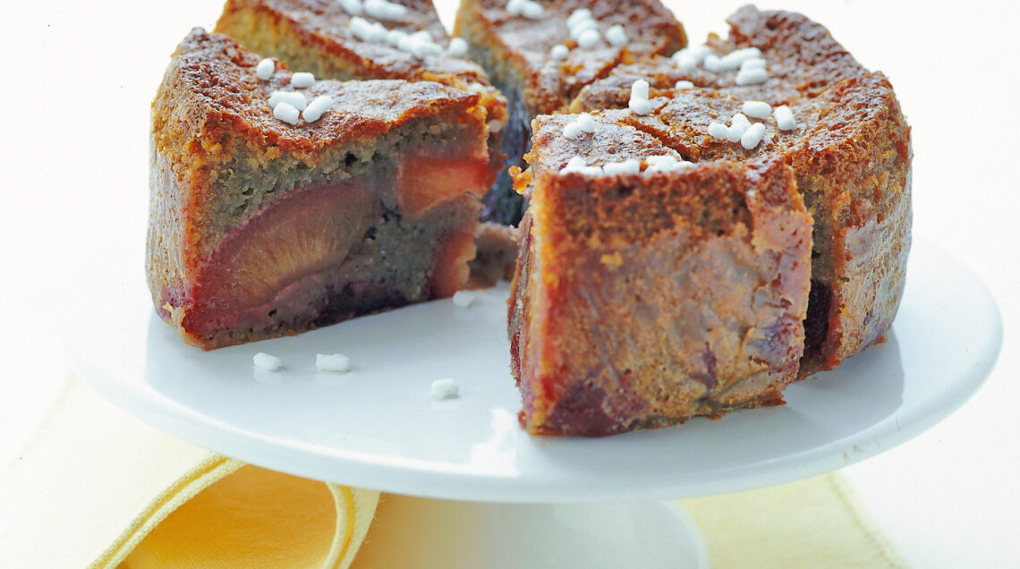 2) Monta il burro con lo zucchero rimasto fino a ottenere un composto a crema e aggiungi le uova, uno alla volta. Quindi incorpora la farina setacciata con il lievito e le prugne con il loro fondo di cottura. Versa il composto per la torta in uno stampo del diametro di 22 cm, rivestito con carta da forno.