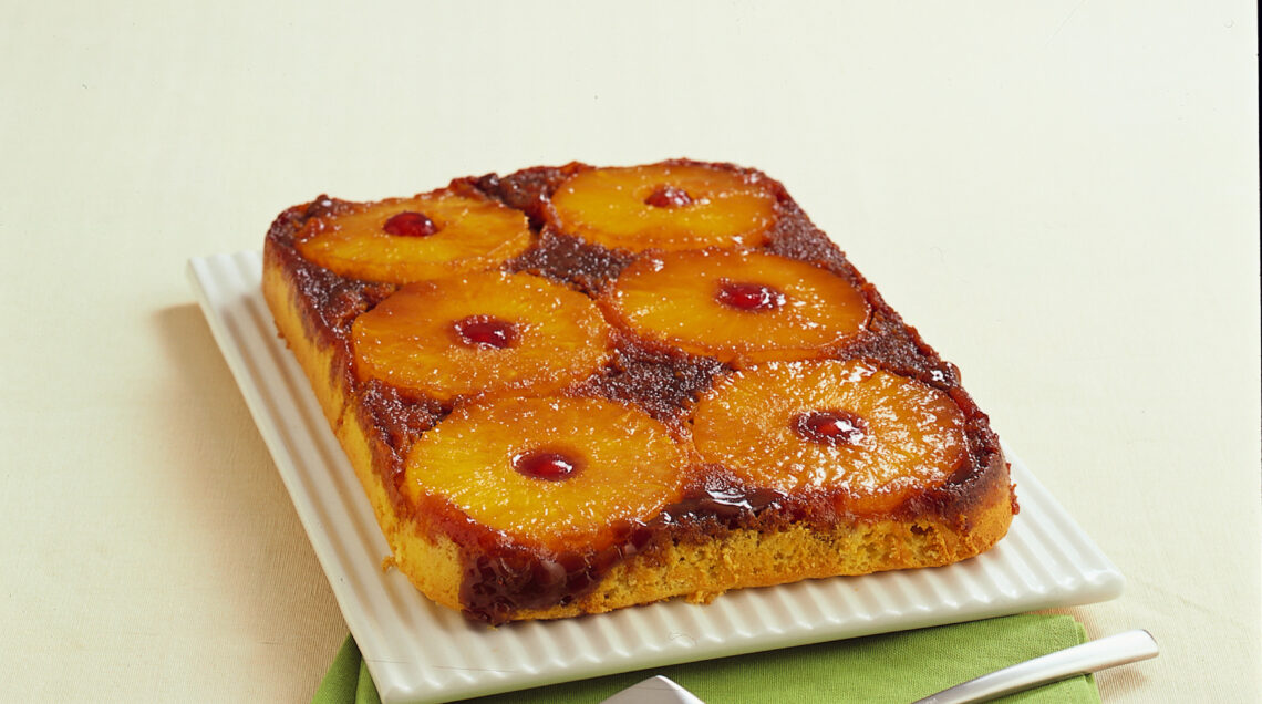 1) Sforna la torta rovesciata di ananas e capovolgila su un piatto da portata o su un’alzatina quando è ancora calda facendo attenzione a non romperla.