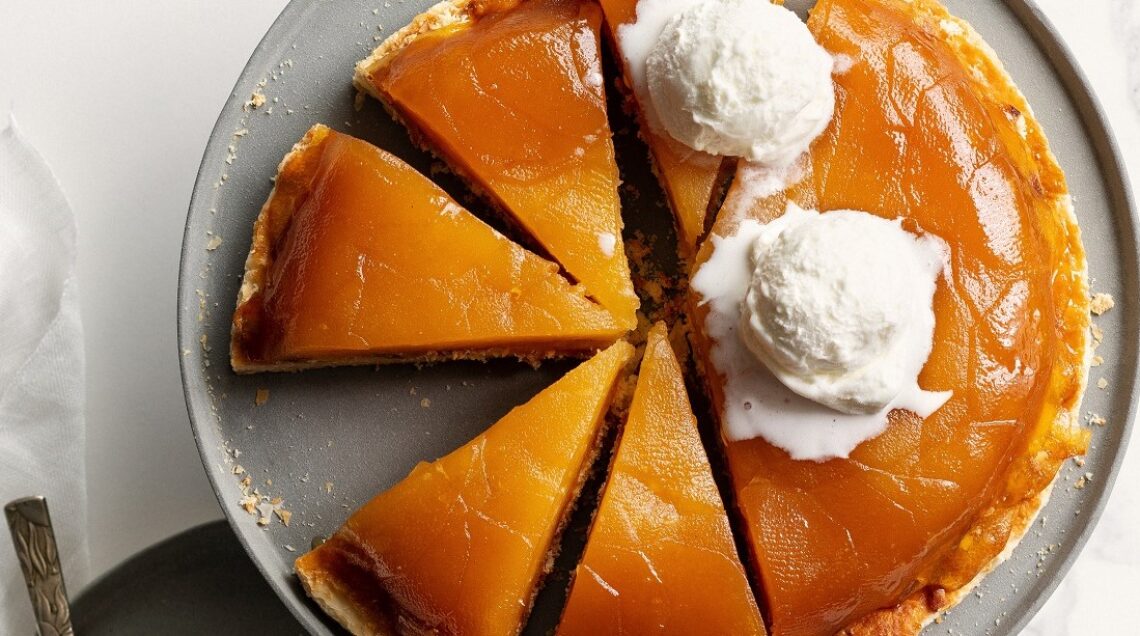 8 Tirate fuori dal frigo lo stampo con le mele, immergetelo per pochi istanti in un tegame con acqua molto calda e capovolgetelo sulla base di sfoglia. Lasciate riposare il dolce per almeno mezz'ora prima di servirlo, accompagnandolo, a piacere, con gelato fiordilatte.