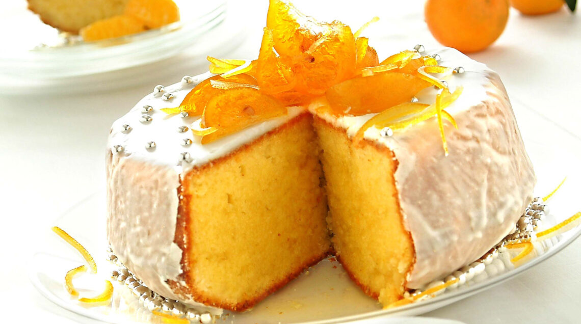 4) Una volta cotta, estrai la torta dal forno, lasciala riposare per 5 minuti e sformala. Adagiala su di una gratella da pasticcere e aspetta che raffreddi. Intanto prepara la glassa con l’albume e lo zucchero. Una volta che la torta è fredda, prima bagnala con lo sciroppo al mandarino, poi aiutandoti con una spatola, ricoprila con la glassa.