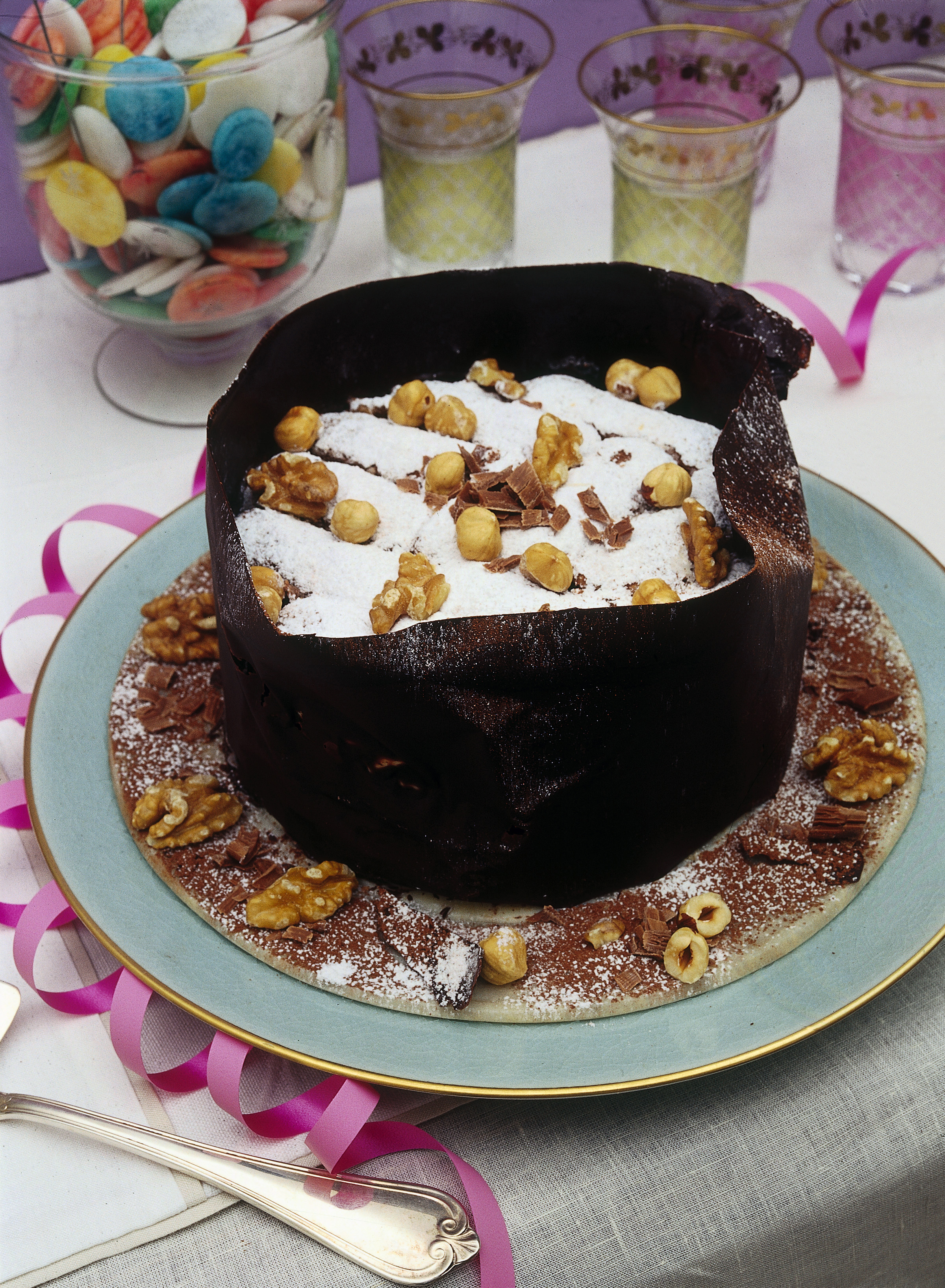 7) Sistema con cura la striscia, dalla parte del cioccolato, attorno alla torta in modo che aderisca perfettamente al bordo e fai combaciare le estremità. Rimetti la torta in frigo finché il cioccolato si sarà completamente solidificato. Stacca con delicatezza il foglio di carta, cercando di non rompere la striscia di cioccolato, e decora con nocciole, noci, cacao e zucchero a velo.