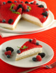 4) Monta lo yogurt rimasto con la frusta elettrica per un minuto, incorporaci la gelatina rimasta e il frullato di lamponi e mescola appena in modo da creare un composto con effetto marmorizzato. Versalo sullo strato di riso e tieni in frigo per 6 ore.