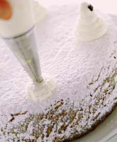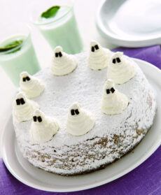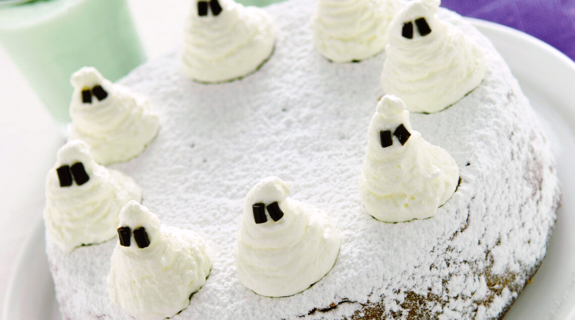 Trasferisci la panna in una tasca da pasticciere con la bocchetta liscia e decora la superficie della torta con tanti conetti, simili a dei fantasmini. Per creare gli occhi, taglia la liquirizia.