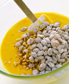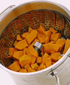Per la preparazione della torta di zucca con fantasmini inizia con il cuocere e frullare la zucca. Una volta pronta, tagliala a dadini di 2 cm circa di lato. Metti il cestello per la cottura al vapore in una casseruola, aggiungi acqua sufficiente a sfiorarne il fondo. Metti la zucca nel cestello, ed il coperchio. Cuoci per circa 20 minuti. Frulla la zucca nel mixer in modo da ottenere un purè omogeneo.