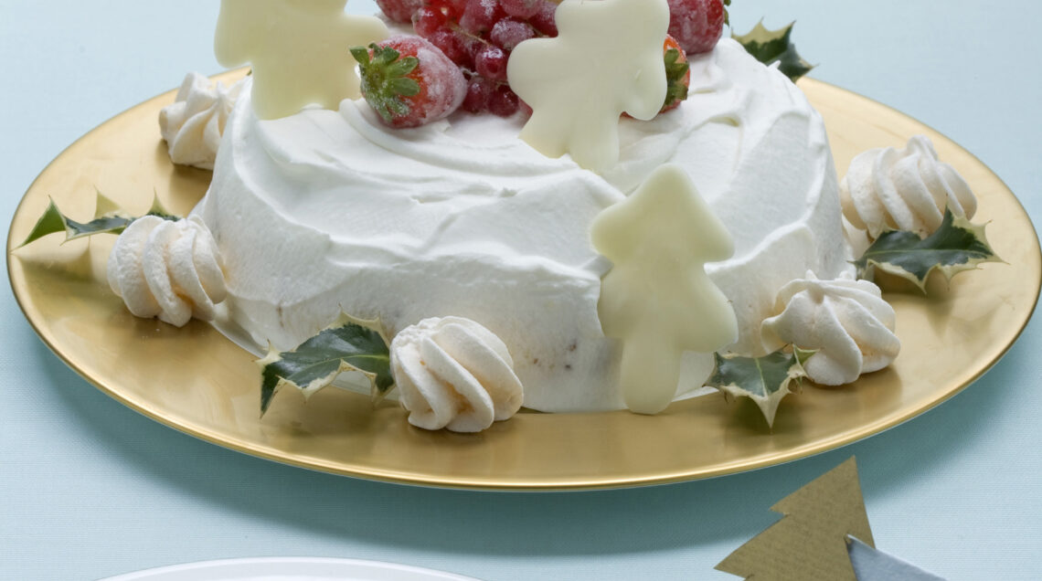 3) Sforma lo zuccotto su un piatto di portata e copritelo con la panna. Sistema alla base le meringhette e le foglie di agrifoglio; guarnisci con fragole e ribes spennellati con albume e zucchero e alberelli di cioccolato.
