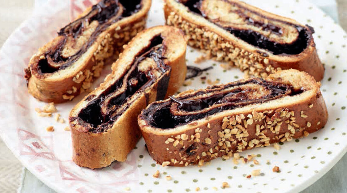 6) Arrotola delicatamente la pasta dal lato lungo formando un cilindro. Sistemalo su una placca, lasciandolo sulla carta, copri con un panno e fai lievitare per 30 minuti. Inforna a 190° per 25 minuti circa. Sforna, spennella il tronchetto con il mix di malto e acqua rimasto e cospargi con la granella di nocciole.