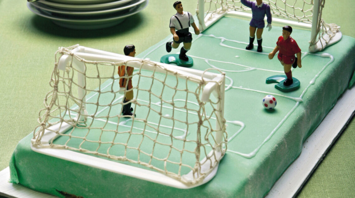 3) Con una glassa bianca disegna, aiutandoti con una siringa senza ago, le linee del campo. Decora con porte e pedine, magari del Subbuteo, e servi.
