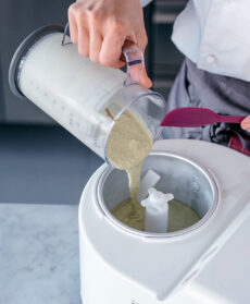 Per il gelato, riunite in una pentola il latte, la panna, il latte condensato, il miele e mescolate. Portate a ebollizione continuando a mescolare, lasciate raffreddare, unite la pasta di pistacchio e frullate. Versate il composto nella gelatiera e mettetela in funzione, poi trasferitela in freezer.
