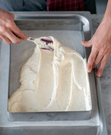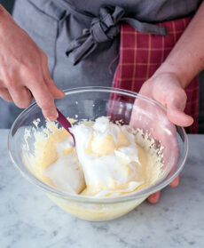 Per il pan di Spagna, separate gli albumi dai tuorli e montate questi ultimi con 100 g di zucchero e i semini raschiati dal baccello di vaniglia. Montate gli albumi con 90 g di zucchero e il sale, uniteli ai tuorli e incorporate la farina e la fecola setacciate, amalgamando con movimenti delicati e utilizzando una spatola.