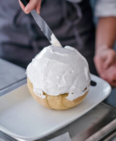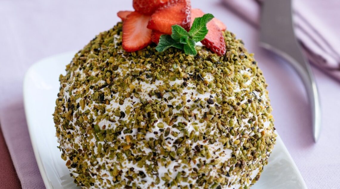 Mettete lo zuccotto sul piatto da portata e, con una spatola, ricopritelo con la meringa. Distribuite la granella di pistacchi. Se vi piace, tagliate a fettine 2 fragole, sistematele come fossero petali sulla sommità dello zuccotto e guarnite con foglioline di menta fresca.
