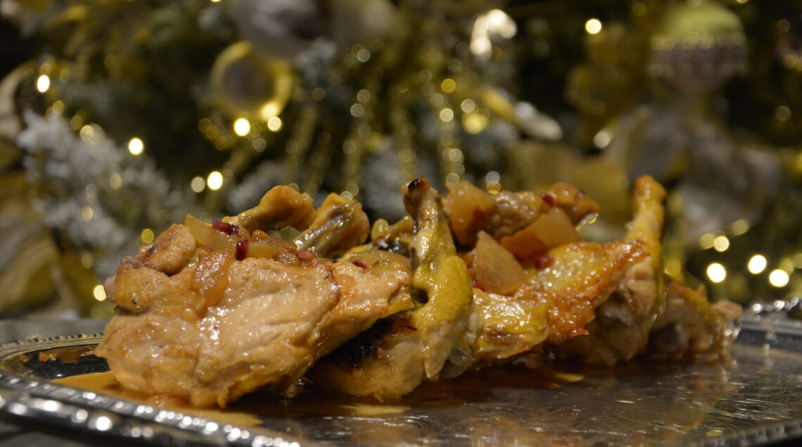 2) Scottate i pezzi di faraona in olio molto caldo, salate e pepate. Spostate i pezzi di faraona in un casseruola pulita e bagnate con il succo di arance e di limone e coprite con brodo vegetale. Verso fine cottura aggiungete la mostarda di pere, l’uvetta sultanina e i chicchi di melograno.