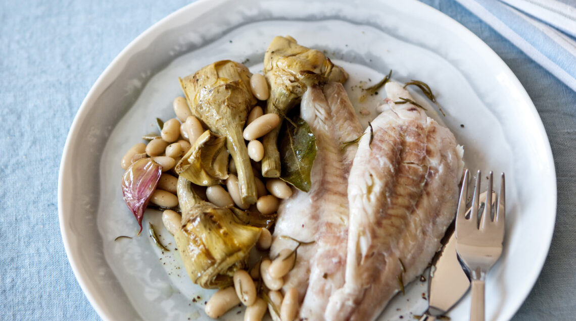 2) Scottate i carciofi in acqua bollente salata per 5 minuti, scolateli, conditeli con olio e pepe. Sistemateli intorno al pesce e cuocete ancora per 20 minuti. Quando lo scorfano sarà pronto, aggiungete i fagioli ai carciofi, coprite e fate riposare con il forno leggermente socchiuso per 10 minuti.