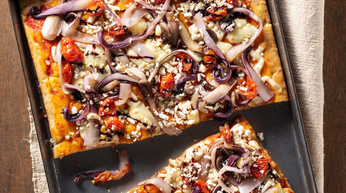 3) Formate 2 panetti e metteteli in ciotole unte di olio, copritele e lasciatele riposare per 30 minuti a più di 20°. Oliate 2 teglie da 40x30 cm e stendetevi i panetti con i polpastrelli, ungendoli d'olio e facendo delle pause. Fate lievitare per 4 ore. Nel frattempo passate i pelati e conditeli con sale e origano. Tagliate i pomodorini a metà e sistemateli su una placca con sale, olio, origano e una spolverizzata di zucchero a velo. Infornate per 15/20 minuti a 250°. Sfogliate il radicchio e lessate le foglie per 2 minuti in acqua salata con 3 cucchiai d'aceto. Stendete i pelati sulle pizze con delicatezza e infornate a 280° per 8-10 minuti, poi distribuite il formaggio a dadi, le foglie di radicchio e infornate ancora a 250° per 5 minuti. Completate con i Pachino, la ricotta e, se vi piace, poca glassa di aceto balsamico.