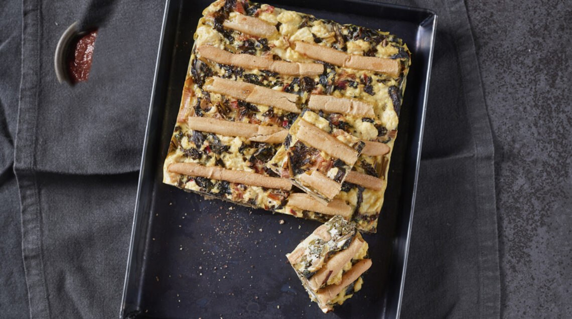 Una ricetta creativa, preparata con coste, bietole, erbette e la ricotta di pecora, più saporita e dal gusto deciso, che rende il composto morbido e cedevole. Uno strato di grissini diventa un'ottima base crunchy per la cottura al forno. La frittate è buona anche fredda, da portare a un pic nic o allietare un brunch.