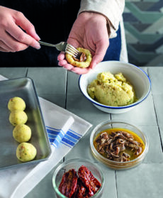 Per le polpette, frullate la mozzarella al mixer con la mollica di pane spezzettata, il grana, 1'uovo sgusciato, una manciata di foglie di prezzemolo tritate e un pizzico di sale. Mettete il composto in freezer per circa 15 minuti, poi formate delle polpettine, inserendo all'interno di ognuna un pezzetto di filetto di acciuga in salsa piccante e uno di pomodoro secco. Passatele nel pangrattato e mettetele in freezer fino al momento di usarle.