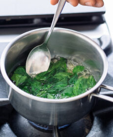 Trasferite le foglie di basilico in un pentolino, unite 180 g di acqua, mettete sul fuoco, portate a ebollizione, poi spegnete. Lasciate raffreddare le foglie immerse nell'acqua di cottura per 20 minuti.