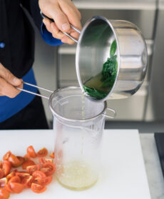 Tagliate i pomodorini a spicchietti senza eliminare i semi. Scolate il liquido di cottura del basilico nel bicchierone del frullatore, facendolo passare da un colino.