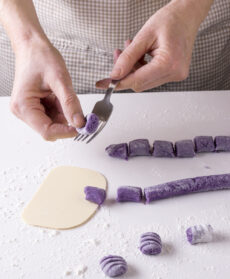 Formate con l'impasto dei lunghi cilindri dello spessore di circa 1 cm, tagliateli a tocchetti e passateli sui rebbi di una forchetta, sistemandoli man mano sulla spianatoia infarinata.