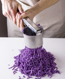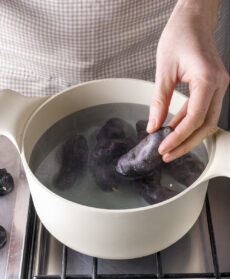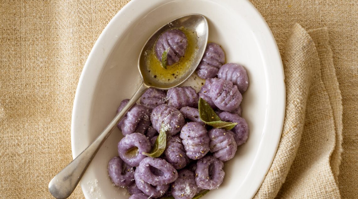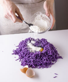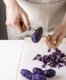Cuocete 600 g di patate viola e passatele al setaccio.