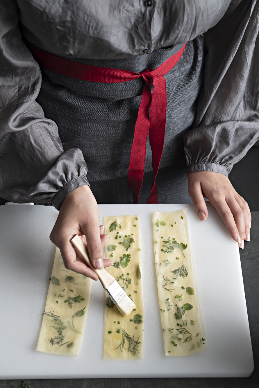 In un pentolino fate fondere a fiamma bassa il burro nel vino. Lavate le erbe e asciugatele, poi selezionate e staccate solo le foglie più piccole o le cimette dei rametti e tenetele da parte. Foderate 2 teglie con carta da forno. Srotolate la pasta fillo e lavorate un foglio alla volta avendo cura di proteggere i fogli che non state utilizzando con pellicola o con un telo pulito per evitare che si secchino all'aria. Dividete ogni foglio in 4 rettangoli di 12x24 cm.