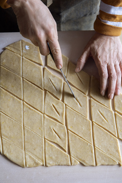2) Ricavate tanti rombi e incideteli con un taglio al centro lungo la diagonale maggiore; sollevate un'estremità di ogni rombo e ripiegatela, facendola passare all'interno del taglio praticato.