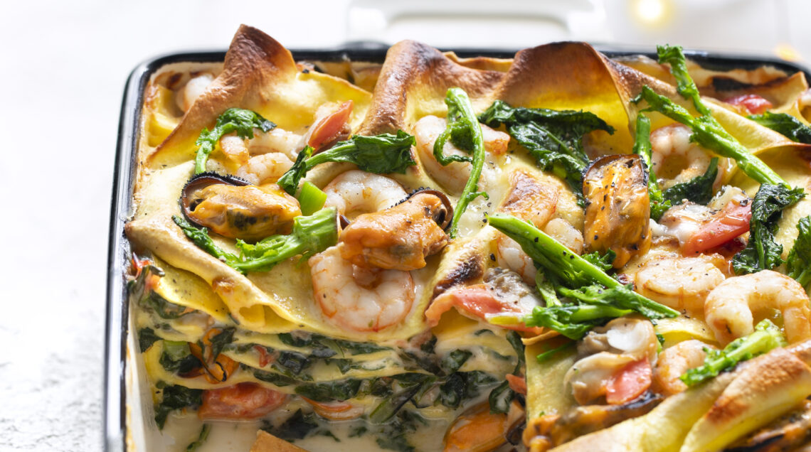 3 Cuocete le lasagne 1 minuto in acqua salata, scolatele e stendetele su un telo. In una teglia oliata, fate uno strato di lasagne, coprite con parte delle cime di rapa, della salsa ai frutti di mare, dei gamberetti e pepate. Proseguite fino a esaurire gli ingredienti terminando con salsa ai frutti di mare e cime di rapa. Coprite con alluminio e infornate a 180° per 30 minuti, scoprendo negli ultimi 5 minuti. Fate riposare qualche minuto prima di servire.