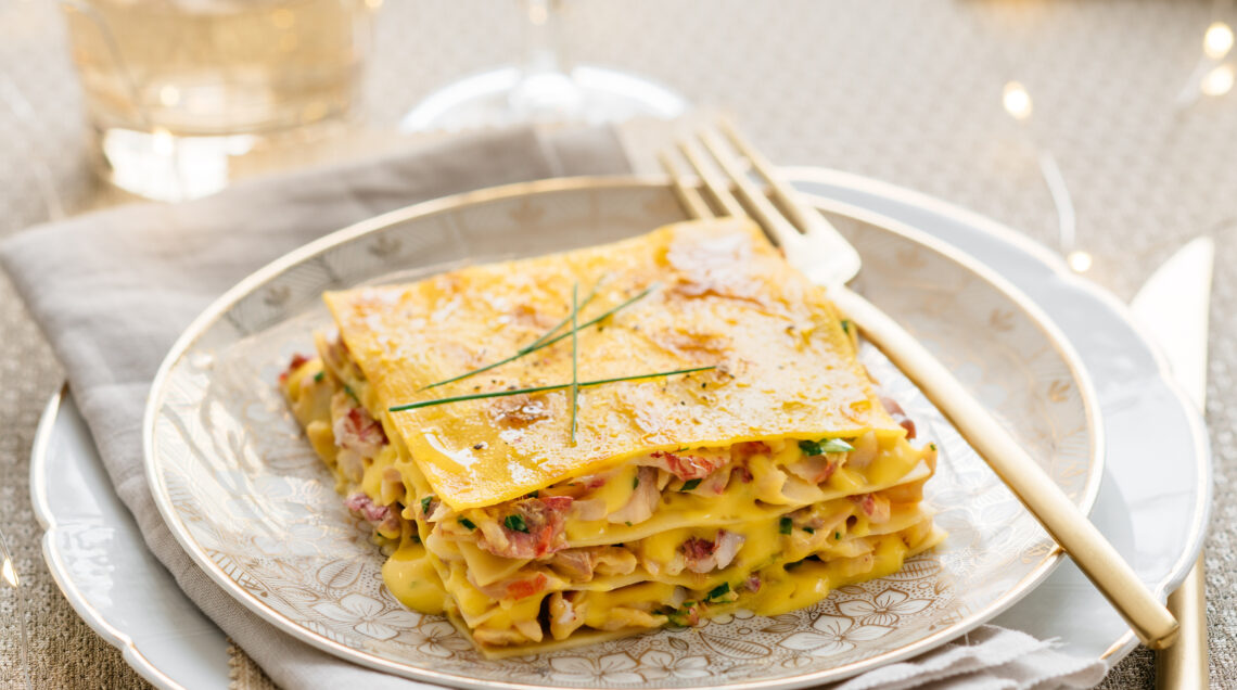 4 Proseguite formando altri strati nello stesso modo, fino a esaurire gli ingredienti. Distribuite sulla superficie qualche fiocchetto di burro e gratinate nel forno a 170° per 20 minuti, coprendo le lasagne con alluminio se la superficie tende ad asciugarsi troppo. Lasciate le lasagne nel forno spento e socchiuso altri 5 minuti prima di servire. Guarnite con steli di erba cipollina.