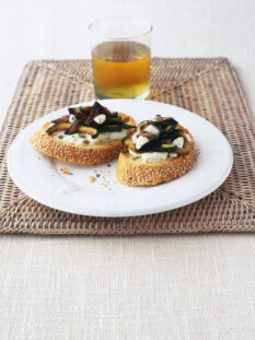 Bruschetta con pomodori misti saltati, caprino, basilico e miele