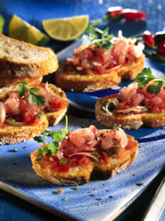Bruschetta con crema di zucchine al forno e gamberoni marinati al lime